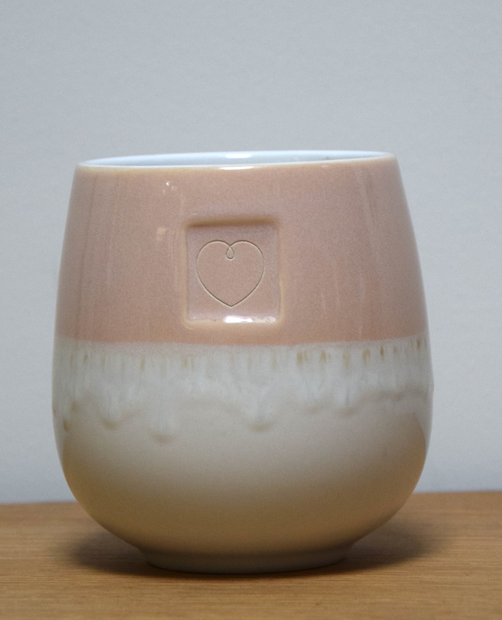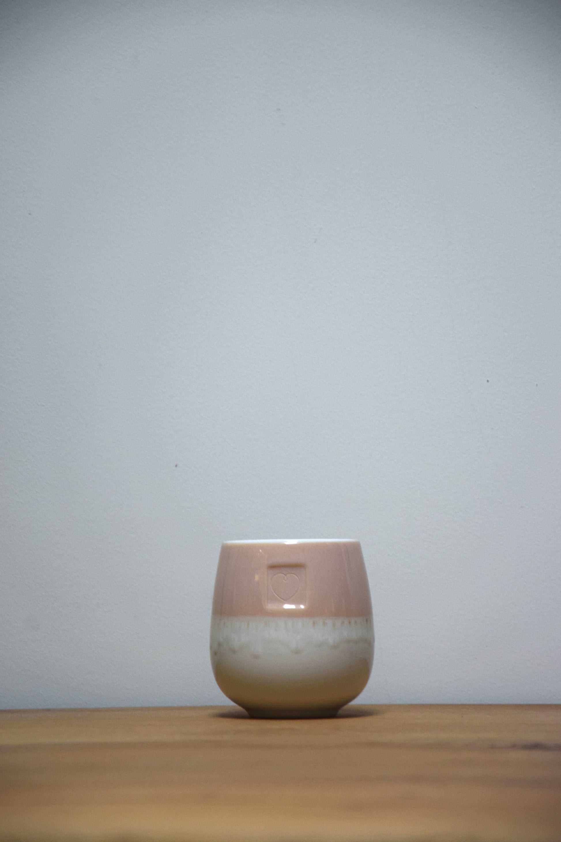 Prachtige, geglazuurde koffietas in een zachte roze kleur met een hartmotief.
